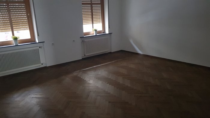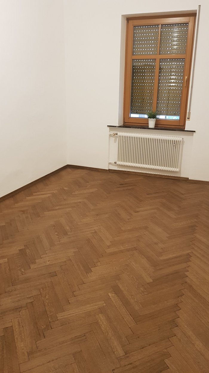 Die Fenster und die Balkontüre sind Holz-Alu mit Rollläden , die Böden in den Wohnräumen geölter Parkettboden , der Boden im Vorraum und im Badezimmer ist Solnhofner Kalkstein.